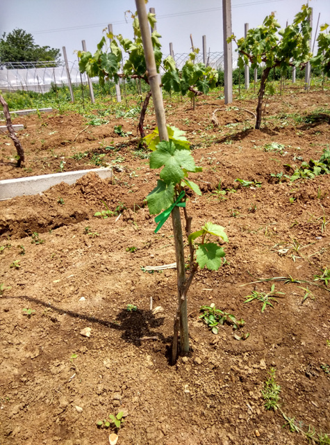 眼下,葡萄小苗已经10-20厘米高,正是定干的关键时期。我院技术人员根据“留下不留上,留壮不留弱”的原则定干,并用竹竿绑缚。葡萄大树枝蔓上已长出串串花序,技术人员根据树势,树形,去掉弱小芽、畸形芽、双芽,保留壮芽、侧芽,每2个梢之间距离10-15厘米,同时,留好通风带、结果带、枝蔓生长带。