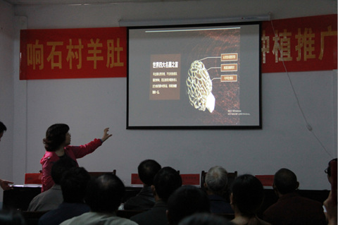随后,刘所长根据该羊肚菌基地的实际情况,采用投影媒体面向村民开展“羊肚菌种植技术”培训,介绍了羊肚菌的生理特性、经济效益和市场前景,并对羊肚菌栽培管理技术进行详细讲述。会场只安排50人参加,响石村村民纷纷自己搬板凳、椅子前来听课,整个会场挤的满满当当。